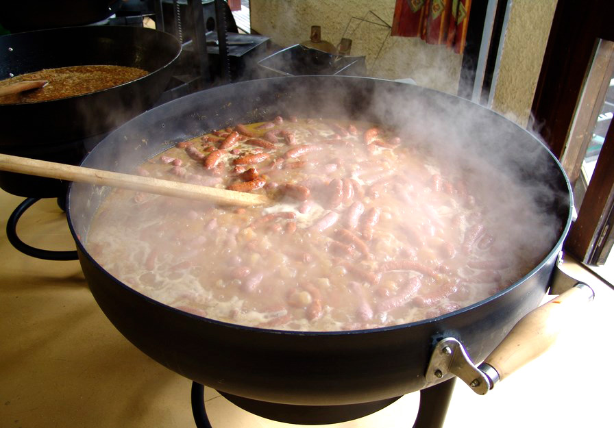 Ils sont préparés dans un chaudron géant, et la polenta est cuisinée dans une poêle géante.